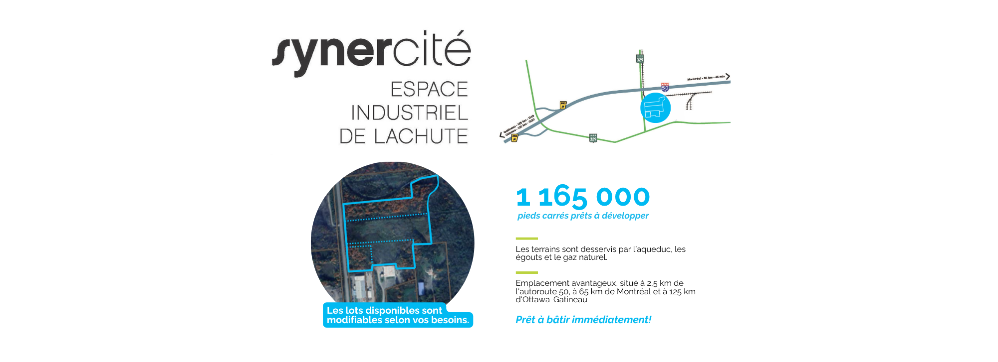 Synercité incarne l’engagement de la Ville de Lachute à être un leader de l’économie circulaire. Vous profitez d’un service d’urbanisme collaboratif qui évalue votre projet selon vos besoins et vous guide vers un emplacement optimal. D’ailleurs, les contraintes urbanistiques ont été réduites au maximum afin de permettre une flexibilité de développement unique au Québec.